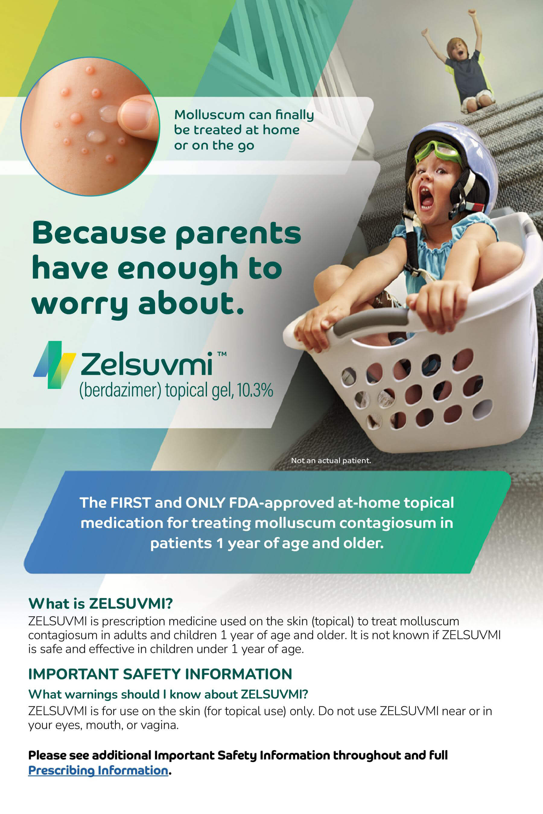 ZELSUVMI is prescription medicine used on the skin (topical) to treat molluscum contagiosum in adults and children 1 year of age and older. It is not known if ZELSUVMI is safe and effective in children under 1 year of age.